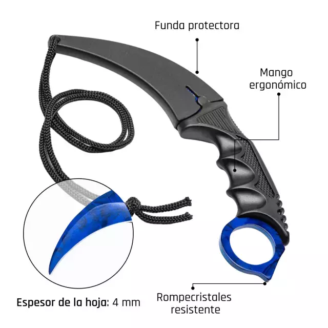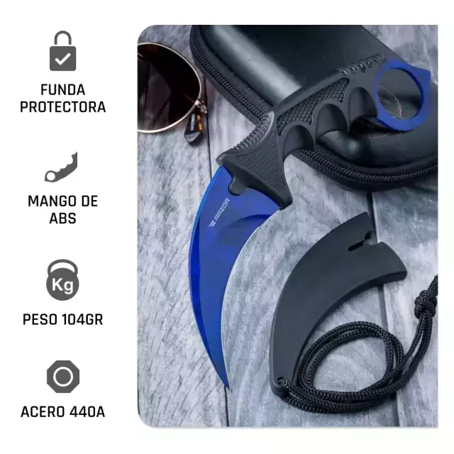 Este cuchillo es perfecto para aquellos que buscan una herramienta funcional y resistente con un diseño inspirado en CS. Con su diseño detallado y características avanzadas, el Cuchillo Karambit Razor será una adición impresionante a cualquier colección y una herramienta indispensable para defensa personal y actividades al aire libre.